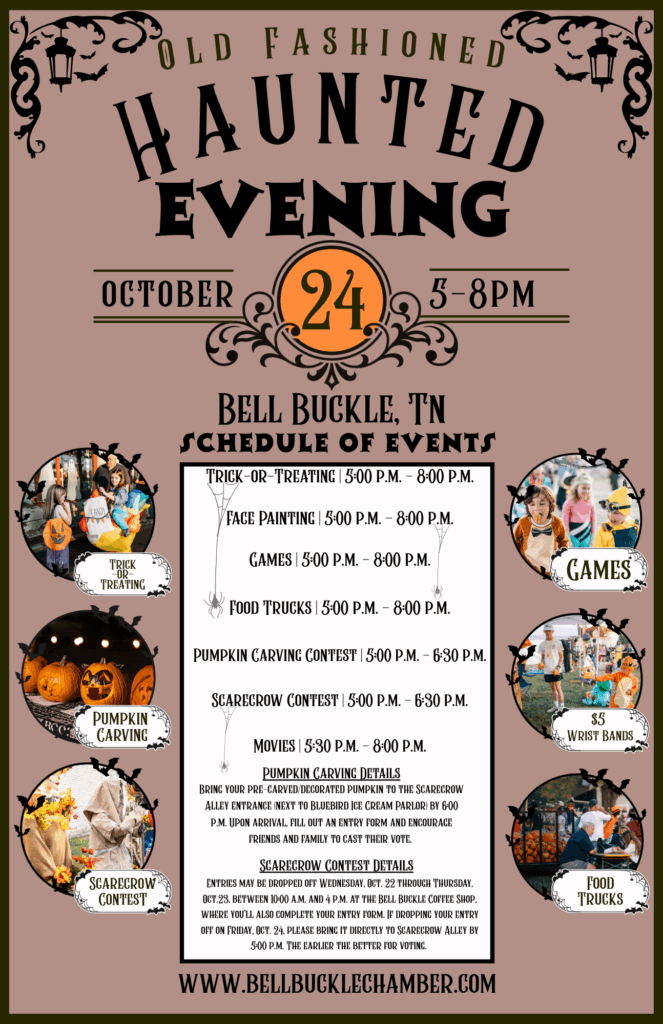 The Bell Buckle Haunted Evening is held the Friday before Halloween (or on Halloween if it falls on a Friday!) annually each October. The event is pure old fashioned Halloween fun complete with store front trick or treating, classic kid-friendly movies, popcorn, face painting, hay maze, our Not-So-Scary Haunted House, Food Trucks, and classic games that kids of ALL ages will enjoy!
